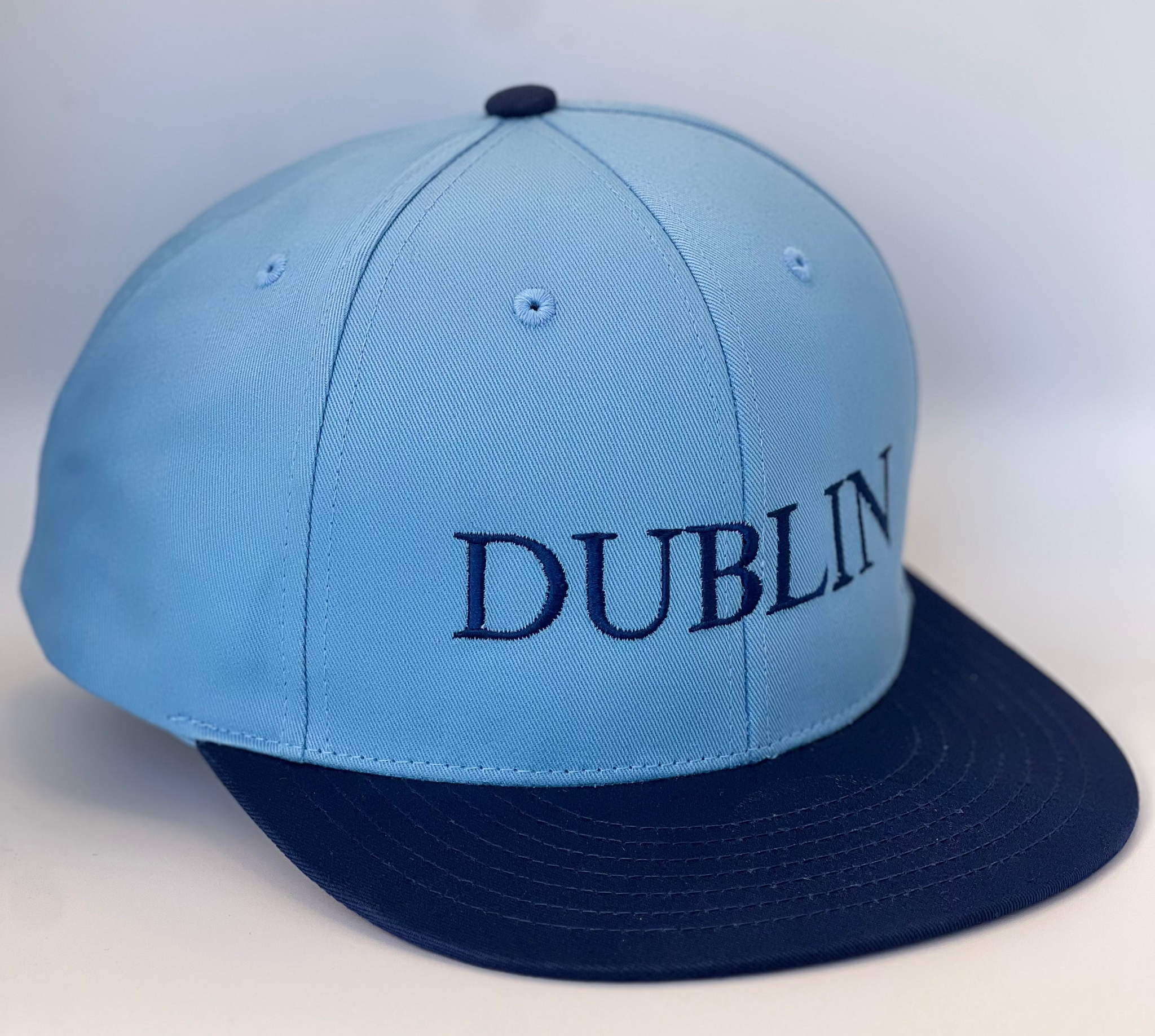 Classic cotton six panel trucker baseball cap. Adjustable snapback fits all sizes. Blue & navy colored hat with navy embroidery.