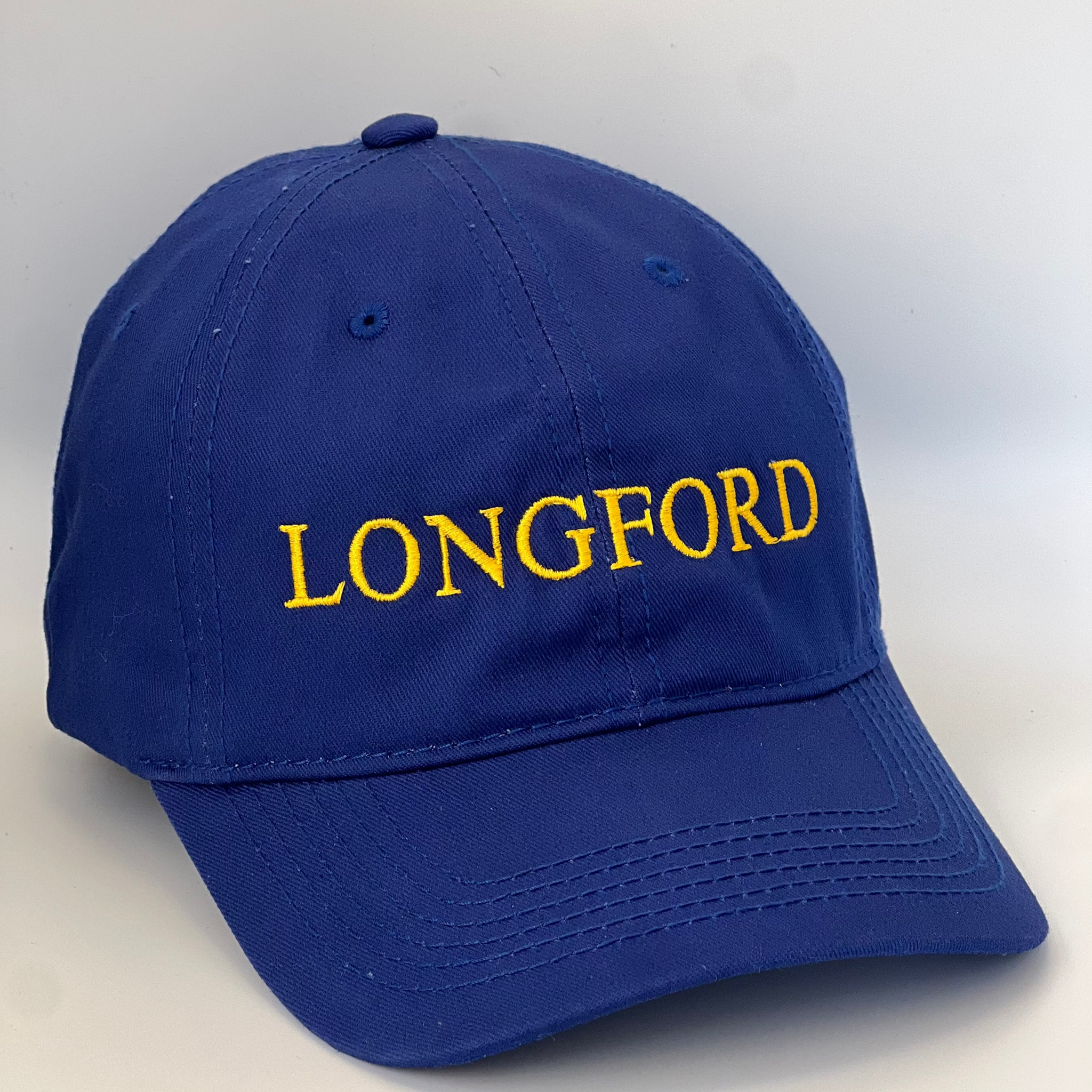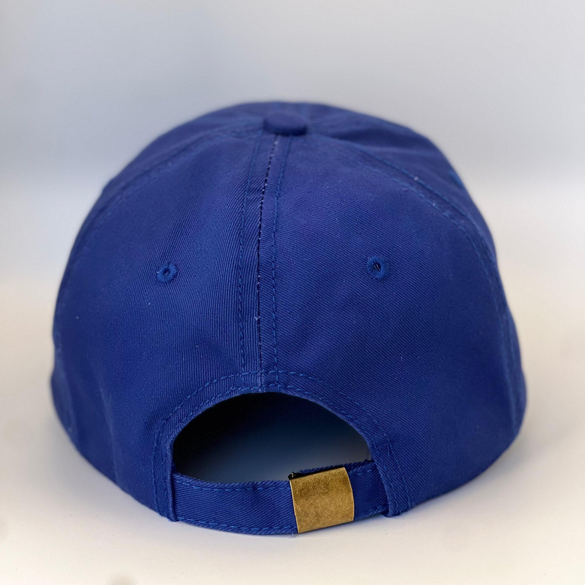 Classic 100% cotton six panel baseball cap with adjustable back strap. Blue colored hat with yellow embroidery.