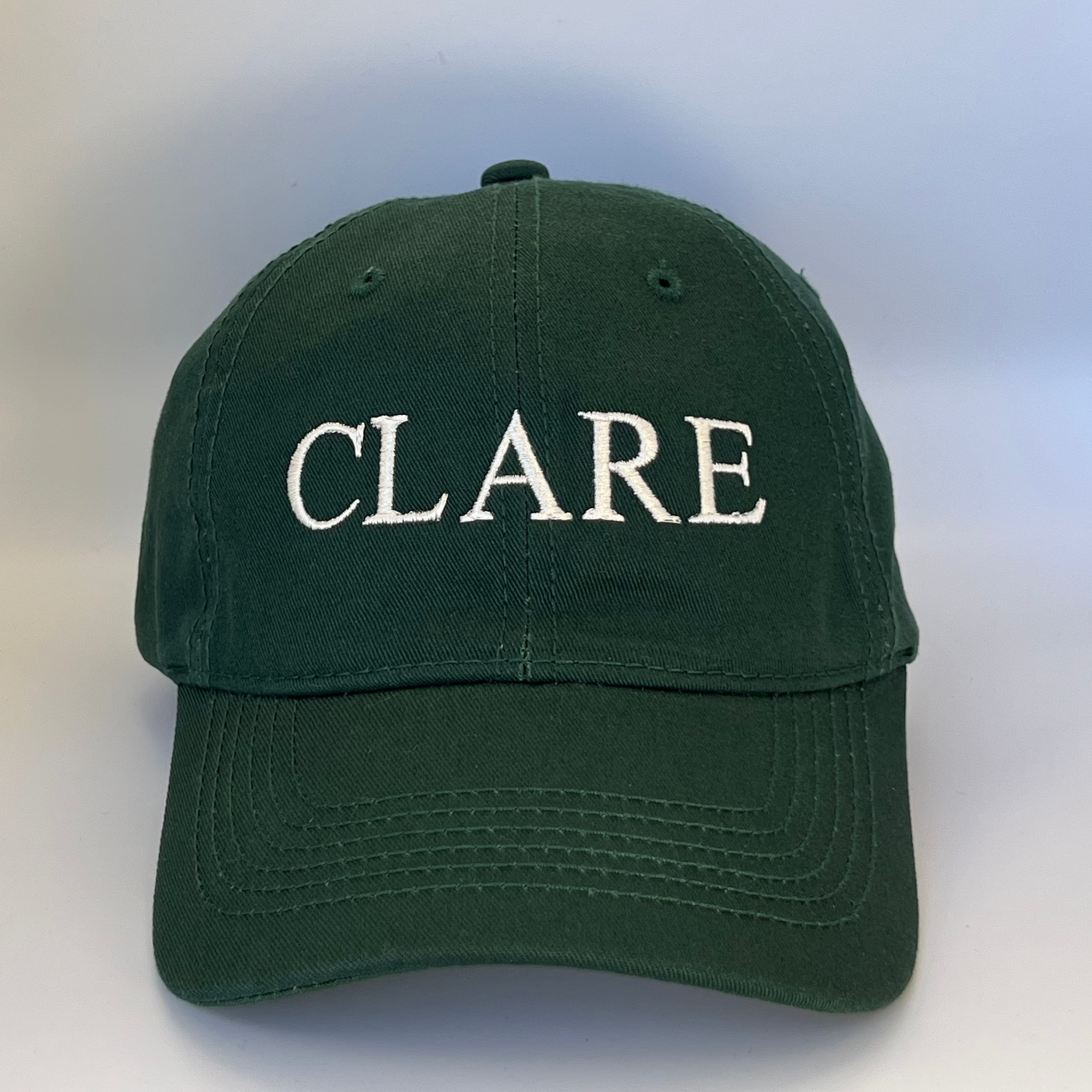 County Clare classic baseball hat. Available in all 32 Irish county names. Rich green colored hat with cream colored embroidery or light beige colored hat with dark green embroidery.