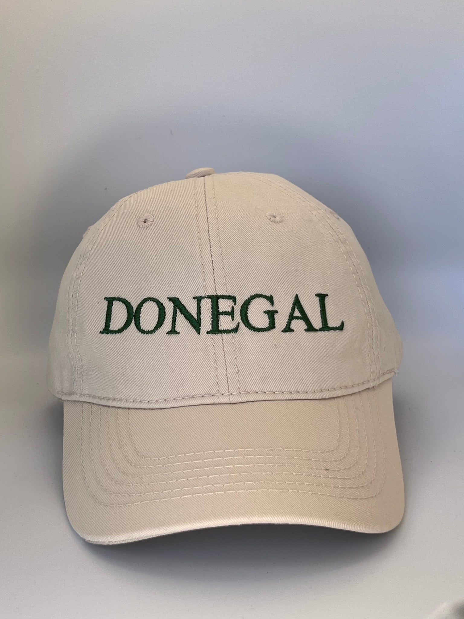 County Donegal classic baseball hat. Available in all 32 Irish county names. Rich green colored hat with cream colored embroidery or light beige colored hat with dark green embroidery.