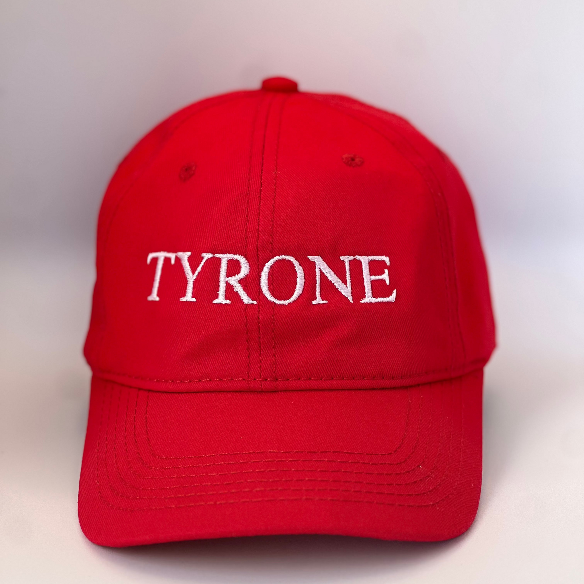 Red baseball cap with 'TYRONE' embroidered in white  on a red background