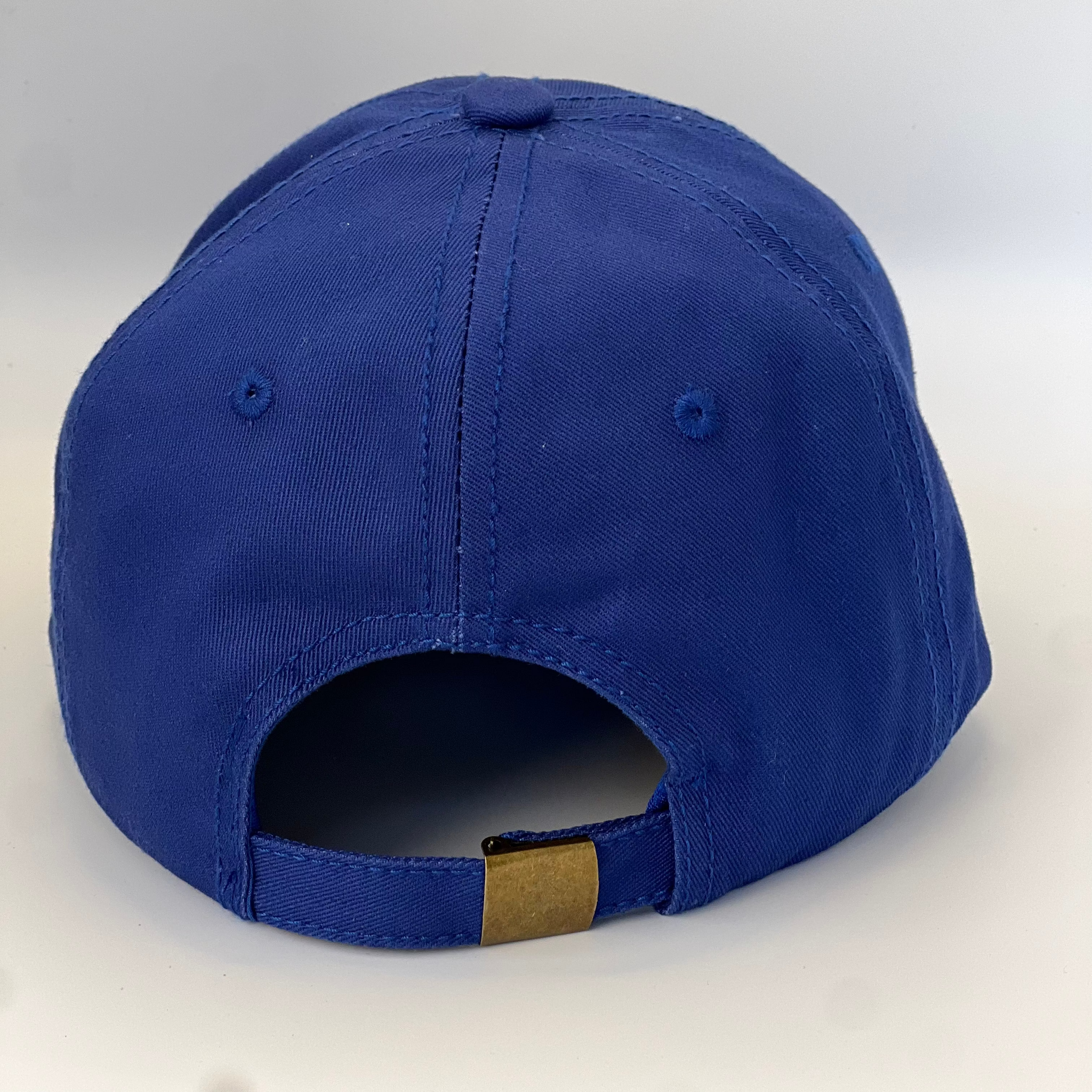 Classic 100% cotton six panel baseball cap with adjustable back strap. Blue colored hat with white embroidery.