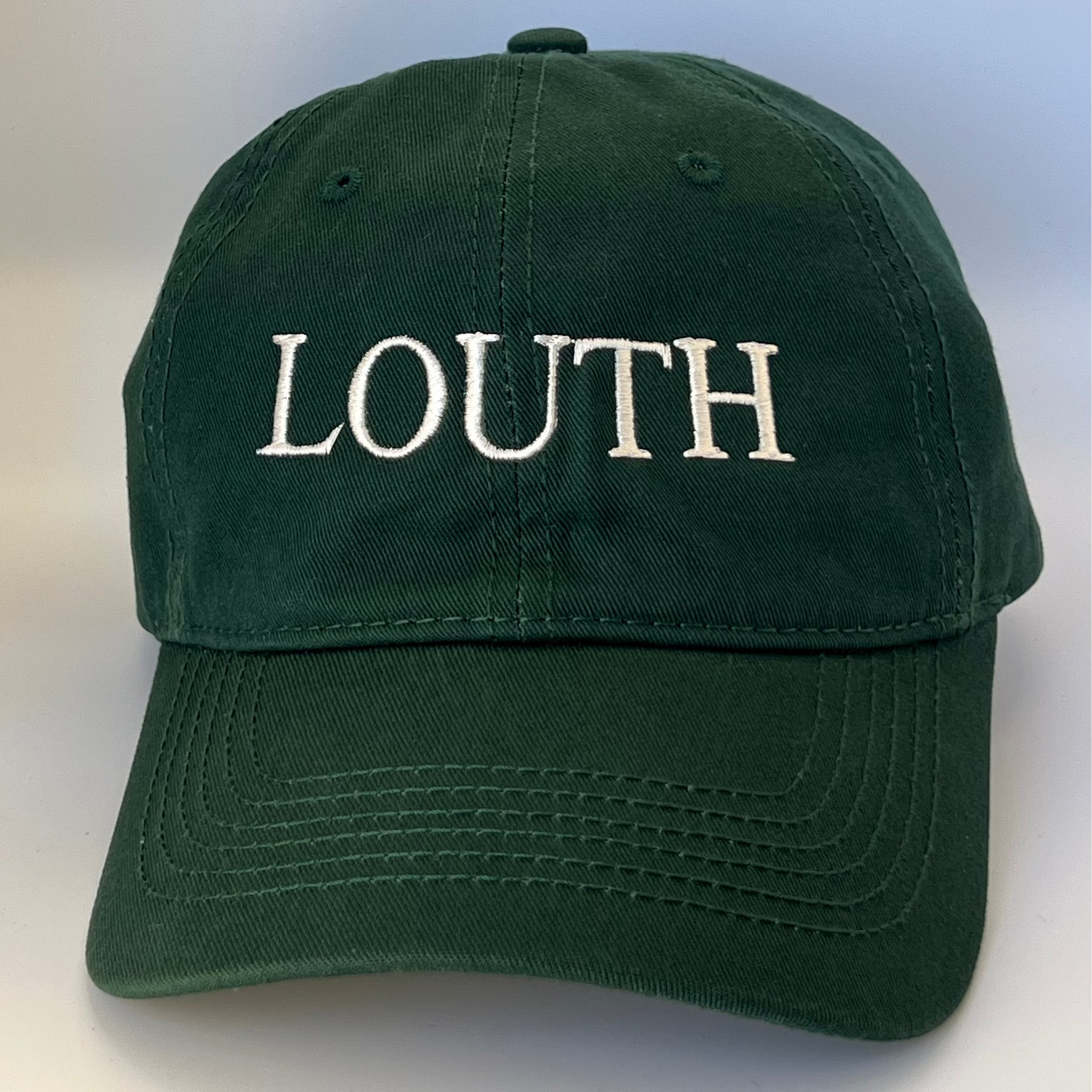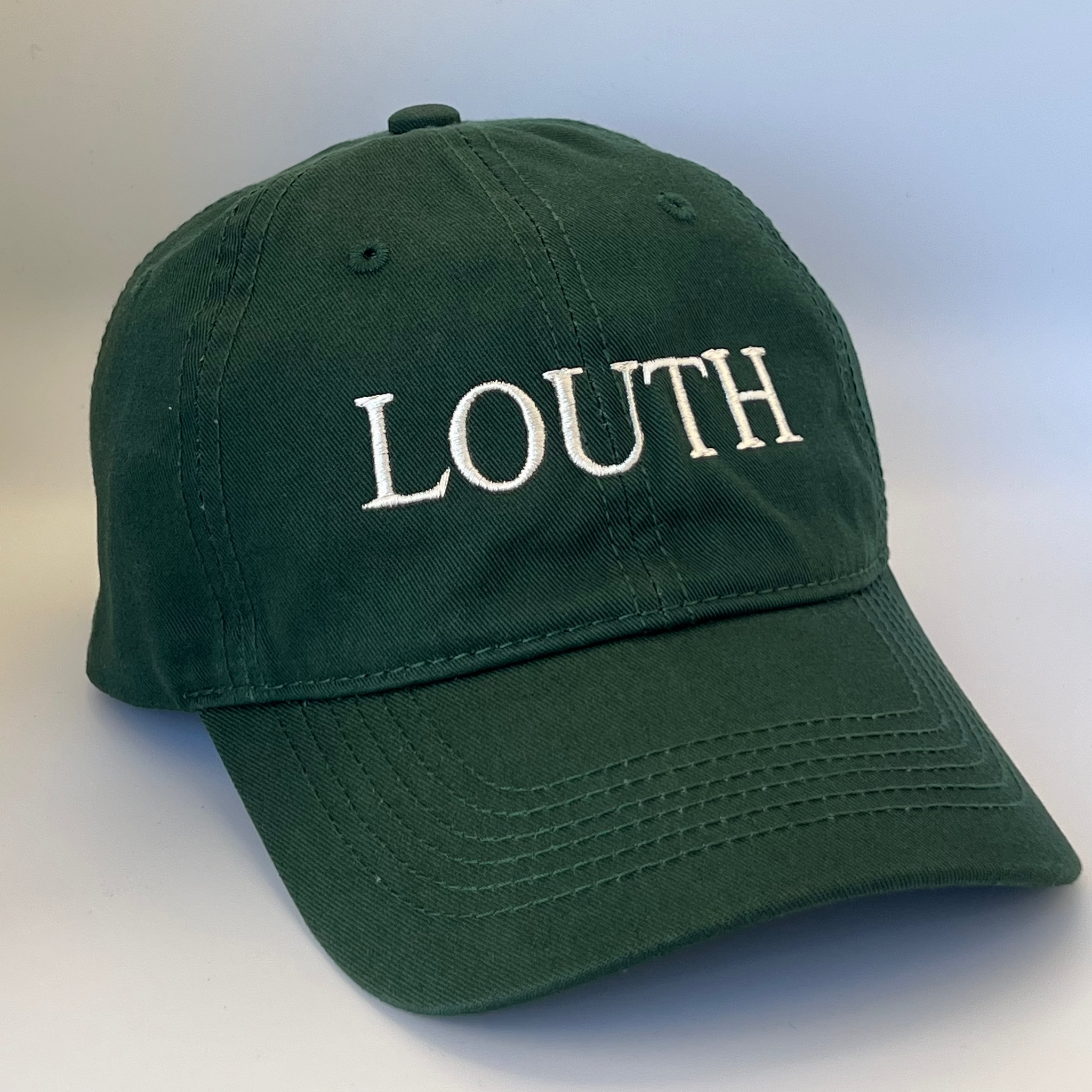 County Louth classic baseball hat. Available in all 32 Irish county names. Rich green colored hat with cream colored embroidery or light beige colored hat with dark green embroidery.