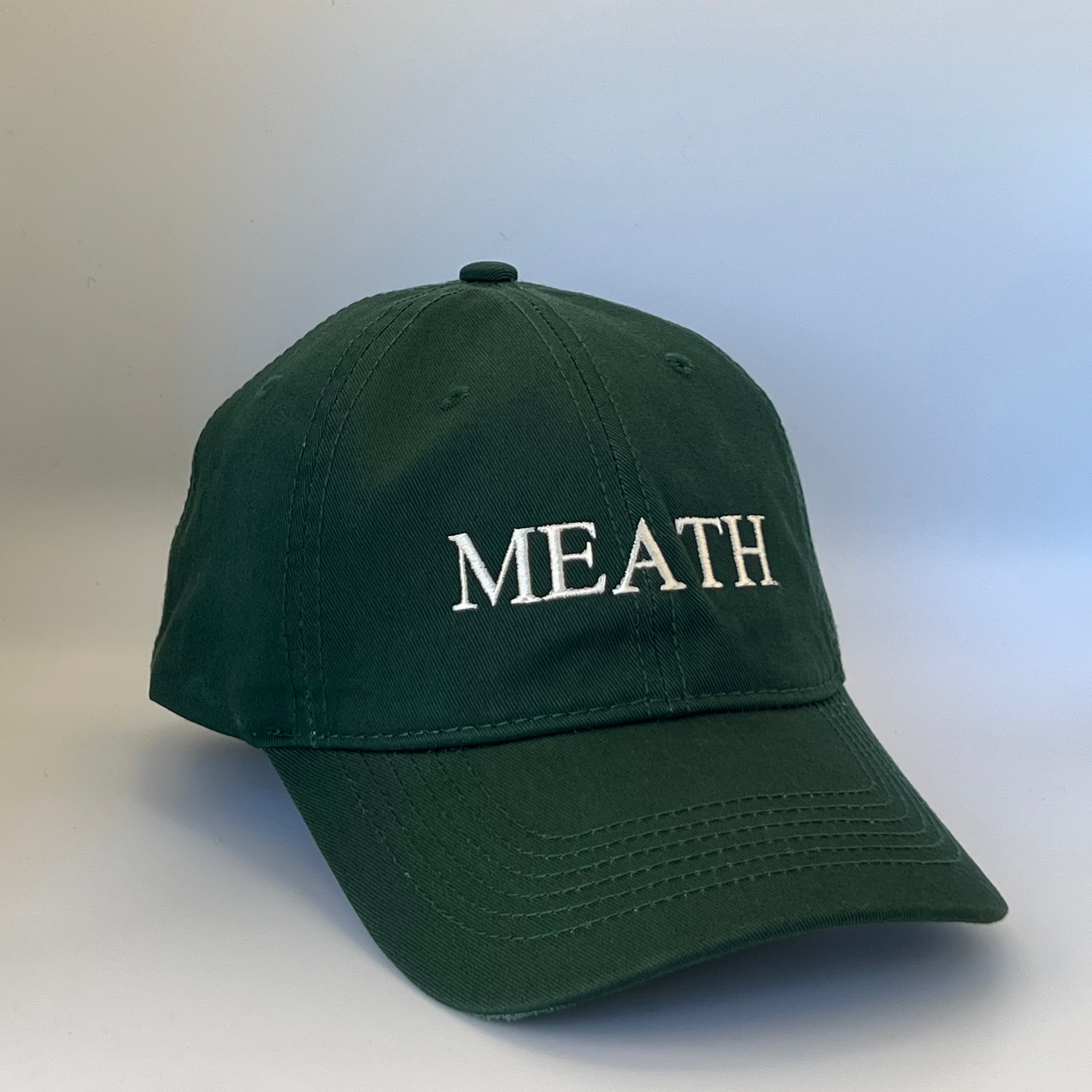 County Meath classic baseball hat. Available in all 32 Irish county names. Rich green colored hat with cream colored embroidery or light beige colored hat with dark green embroidery.