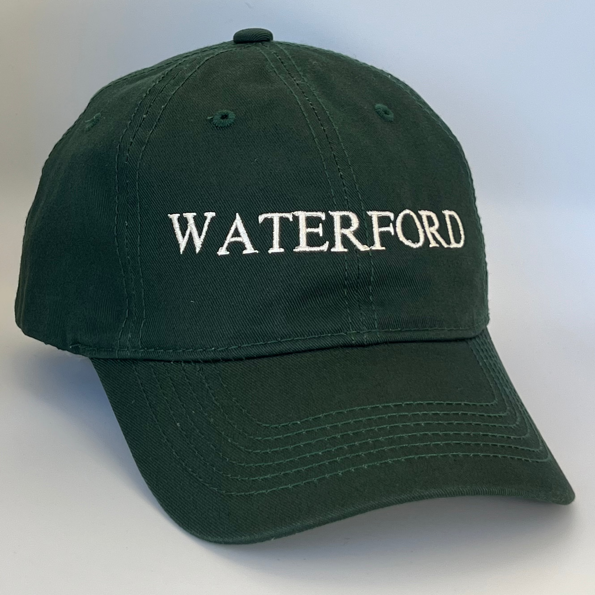 County Waterford classic baseball hat. Available in all 32 Irish county names. Rich green colored hat with cream colored embroidery or light beige colored hat with dark green embroidery.