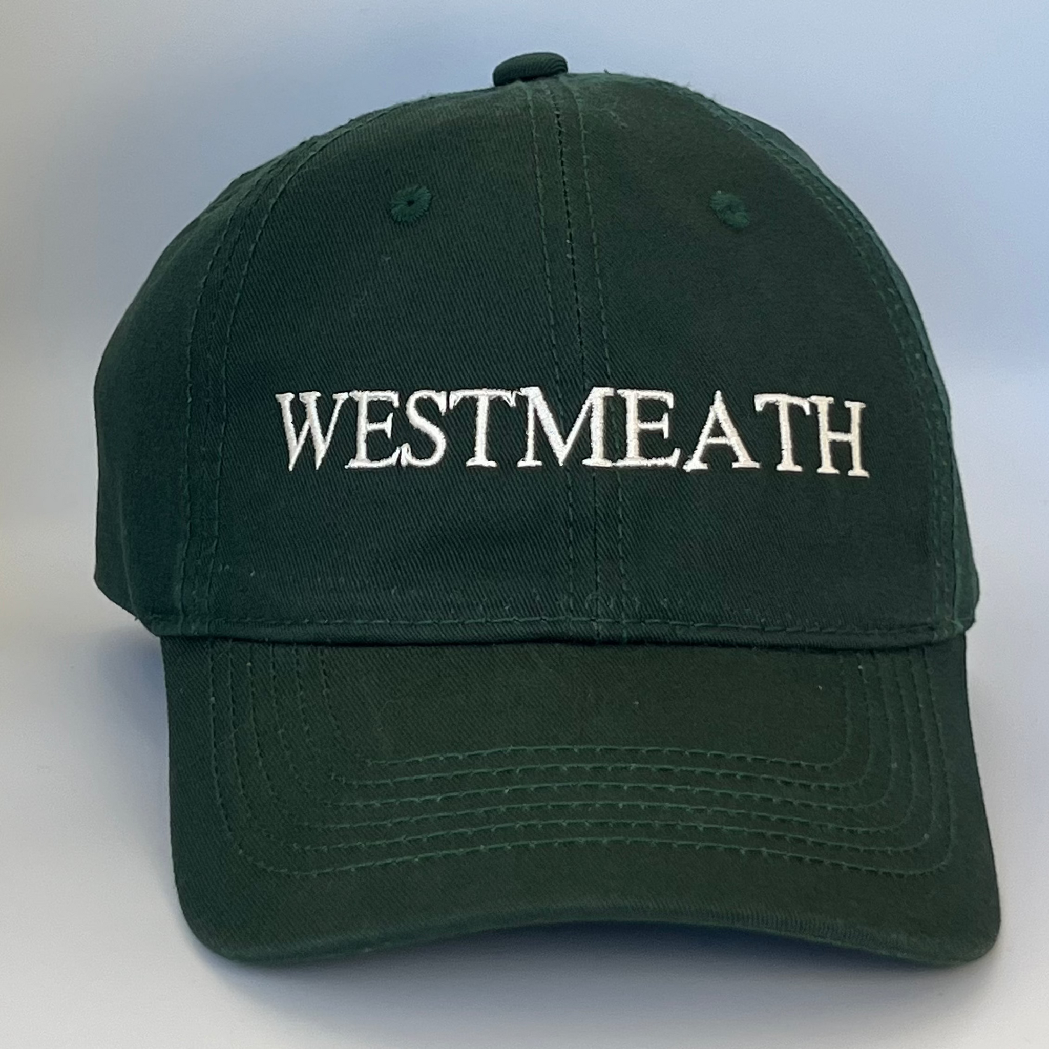 County Westmeath classic baseball hat. Available in all 32 Irish county names. Rich green colored hat with cream colored embroidery or light beige colored hat with dark green embroidery.