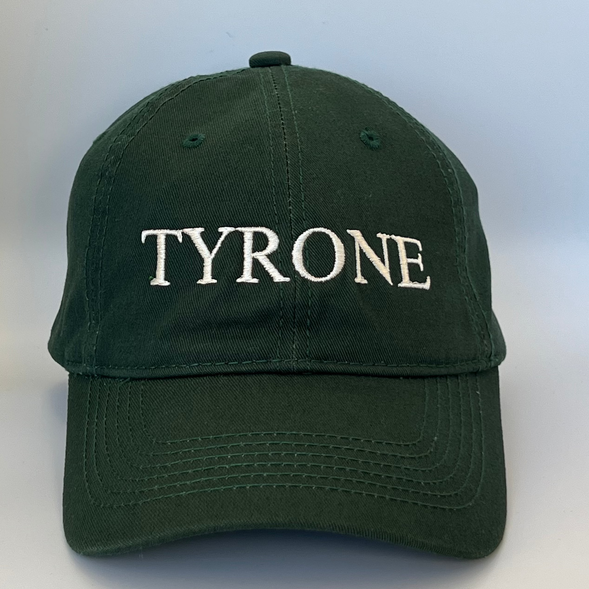 County Tyrone classic baseball hat. Available in all 32 Irish county names. Rich green colored hat with cream colored embroidery or light beige colored hat with dark green embroidery.